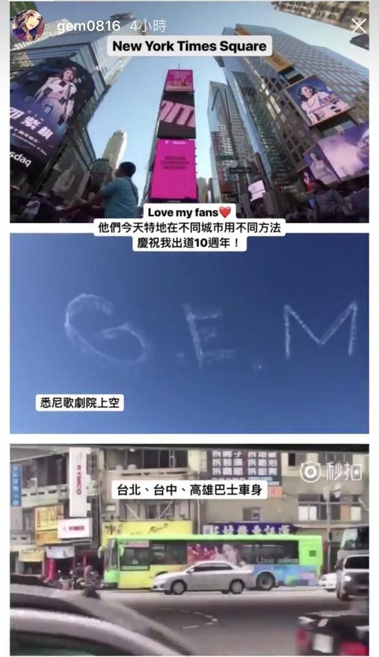7月10日是邓紫棋出道十周年的纪念日,她也在个人社交账号激动的晒出了全球各地粉丝送给她的庆祝礼物。其中美国粉丝斥资买下纽约时代广场的左、右大楼电视广告LED屏幕,播放短片中赫然写着:“祝邓