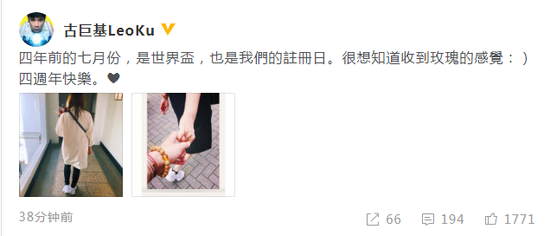 7月12日,古巨基发文庆祝结婚四周年:“四年前的七月份,是世界杯,也是我们的注册日。很想知道收到玫瑰的感觉:)四周年快乐。”并晒出妻子陈韵晴手捧玫瑰的背影照以及两人手指紧扣的照片,大撒狗粮。