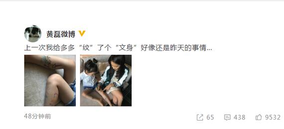 7月14日下午,黄磊晒出了一组大女儿“多多”给小女儿“多妹”画“文身”的照片。照片中“多多”在妹妹腿上画