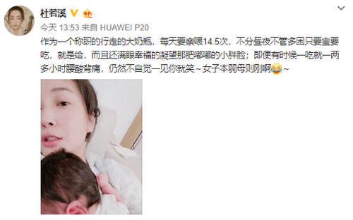 早前杜若溪公布产女8斤7两重,被网友笑称为是“娱乐圈最重明星宝宝”。自生产之后她表示“感恩知足,我去做奶牛了”之后,就全身心照顾宝宝,像忘记了密码一样,一直没有再发过微博。昨天,杜若溪更博称:“作为一个称职的行走的大奶瓶,每天要亲喂14.5次,不分昼夜不管多困只要宝要吃,就是给,而且还满眼幸福的凝望那肥嘟嘟的小胖脸;即便有时候一吃就一两多小时腰酸背痛,仍然不自觉一见你就笑~女子本弱母则刚啊~”。照片中杜若溪怀抱宝宝,眼神里满是宠溺,看起来应该是刚喂完奶,宝宝趴在妈妈怀里熟睡。素颜出镜的杜若溪皮肤状态超好,气色恢复的也不错,尤其是跟孕晚期“胖成球”又憔悴状态比起来,虽然只露了半张脸,也能明显看出瘦了不少。