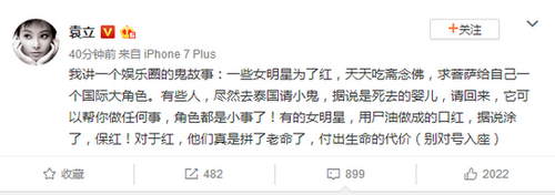 17日晚,袁立发微博讲了有关一个娱乐圈的鬼故事:“一些女明星为了红,天天吃斋念佛,求菩萨给自己一个国际大角色。有些人,尽然去泰国请小鬼,据说是死去的婴儿,请回来,它可以帮你做任何事,角色都是小事了!有的女明星,用尸油做成的口红,据说涂了,保红!对于红,他们真是拼了老命了,付出生命的代价。”随后,她还补充到:“红,是她们的信仰!可以不择手段,可以没有尊严,可以不顾一切!”