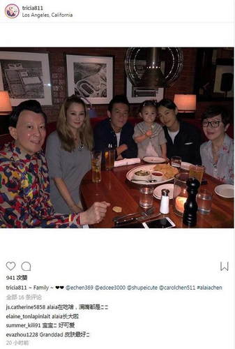 7月18日,陈冠希姐姐在个人社交平台上晒出了一张家庭聚会的合影,在照片中一家人围坐在一起,看起来非常温馨和谐。其中爷爷面色红润,看上去也非常开心。陈冠希秦舒培和女儿一家三口依偎在一起,女儿alaia看
