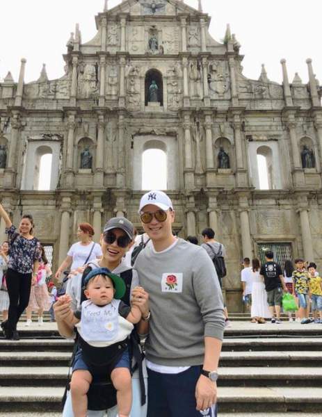 7月18日,胡杏儿在微博晒出一张一家三口的合影并配文:“奕霆拿到护照及身份证后第一次离开香港,带着公公婆婆,爷爷奶奶一行人6大1小坐船过大海到了澳门,谢谢酒店管家姐姐照顾,两晩行程一切顺利,希望下次来BB你会走路了,妈妈腰快断了,因为你真的很重!”照片中胡杏儿一家三口在澳门标志性建筑物大三巴牌坊前甜蜜合影,儿子坐在婴儿背带上露出肉嘟嘟的小腿,十分可爱。