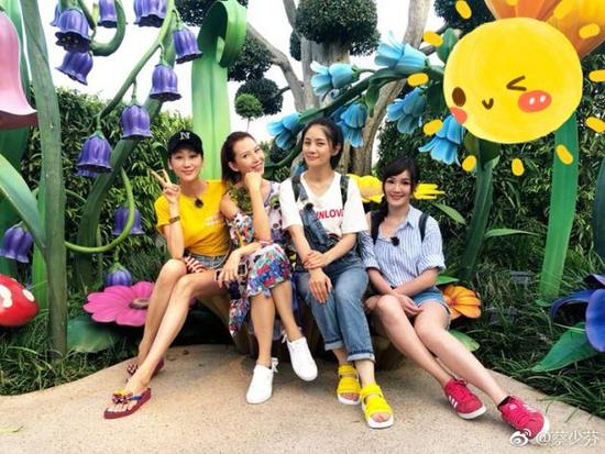 18日,蔡少芬晒出一张和综艺《不可思议的妈妈》妈妈团的合影,并且配文:“来,见个面。”在照片中,蔡少芬和胡可、池亚凌、蒋丽莎坐在长椅上亲切合照,妈妈们笑容洋溢,蒋丽莎大长腿瞩目,尽显辣妈们的魅力。