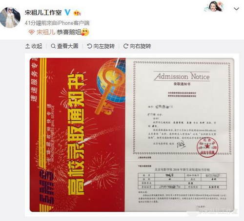 宋祖儿工作室晒录取通知书