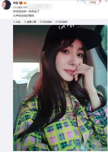 7月20日,杨幂在微博晒出一张自拍,并配文“存货自拍来一张我走了,大声告诉我好看吗 ”。照片中,杨幂身穿个字衬衫,头戴鸭舌帽,皮肤简直能出水了!