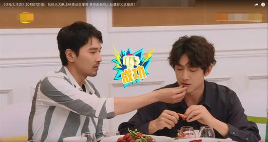 在节目开始录制前,林更新、赵又廷、马思纯,及节目的五位主持人聚集在一起吃饭,林更新被指派的任务就是,“让所有人一起举杯两次,及让赵又廷帮他擦嘴”,为了方便完成任务,林更新以方便夹菜的借口,硬是与马思纯换位子,坐到了赵又廷身边,正当他烦恼着要怎么完成任务时,他见到女主持人谢娜不小心把汤汁溅到自己身上,众人忙于帮谢娜擦拭,他随即假装吃东西,让食物沾上自己的嘴巴,不断地转头看向身边的赵又廷,希望引起对方的注意,在第二次尝试就已经成功与赵又廷对到眼,对方看到他嘴巴脏了,直接就用手帮他擦掉,超暖心举动瞬间让大批粉丝少女心喷发,该画面也引起了不少讨论。