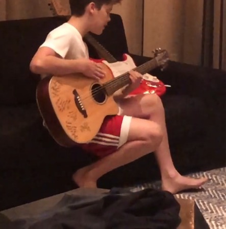 影片中,克鲁兹身穿白色T恤及红色运动短裤,打扮得非常居家,他一手拿着吉他,一边哼唱小贾斯汀的《Love Yourself》,虽然没有音乐伴奏,但音准却十分到位,搭上他稚嫩的清亮嗓音,听起来颇有他自己个人的味道。他闭着眼练习,似乎沉醉在其中,完全没有发现自己被偷拍了,妈妈维多利亚还将该影片PO在IG上,调皮地表示:‘当你在克鲁兹早上暖嗓的时候偷袭他!’
