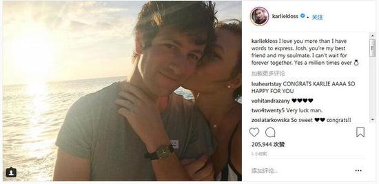 25日凌晨,卡莉-克劳斯在INS晒出与男友约书亚-库什纳的亲吻照片,宣布两人订婚。卡莉-克劳斯与投资大亨男友约书亚-库什纳于2102年在维多利亚的秘密的秀后派对上曝光恋情,相恋6年终于结成正果。
