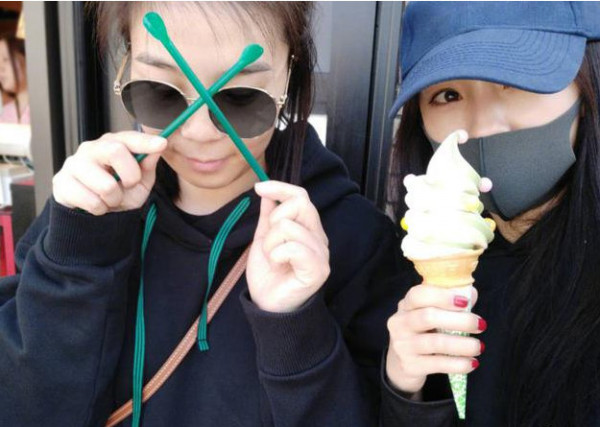 照片中的杨幂戴着蓝色鸭舌帽,口罩遮面,只露出眼睛,手里拿着冰淇淋对镜自拍,一旁的经纪人孙婷则拿着两个冰淇淋勺子交叉放在脸上,搞怪十足。
