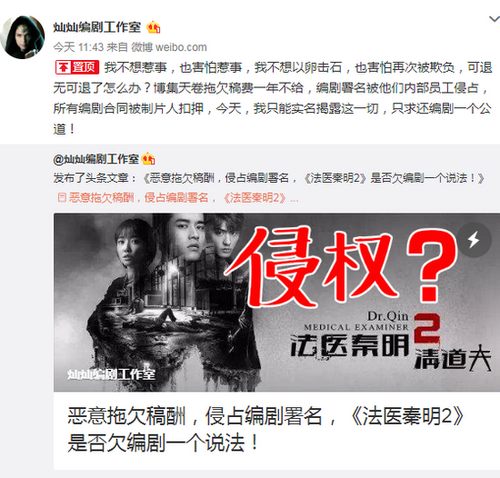 7月28日,编剧张灿灿在微博公开控诉《法医秦明2清道夫》团队拖欠编剧报酬,并且霸占了原属于自己的编剧署名权。