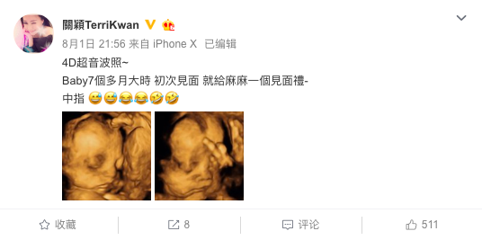 关颖晒三胎宝宝B超照 宝宝竟然竖中指