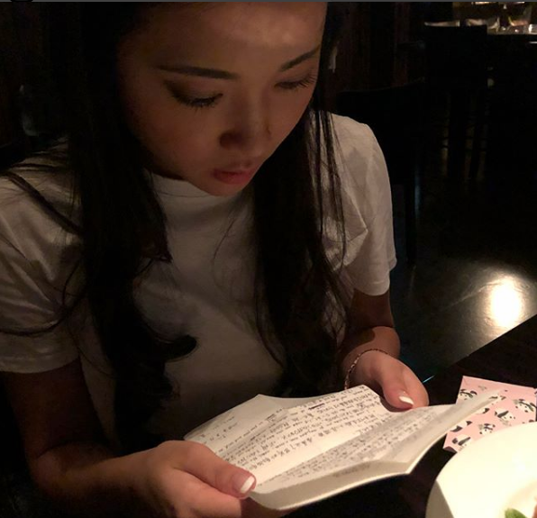 蒋劲夫视角下的女友正在昏暗的灯光下正低着头看手中的信,一头乌黑秀发让整个人看起来靓丽十足,五官也是十分秀气。整个餐厅的氛围低调又浪漫,还有钢琴音乐烘托在其中,这顿庆祝纪念日的烛光晚餐也是恩爱十足了。