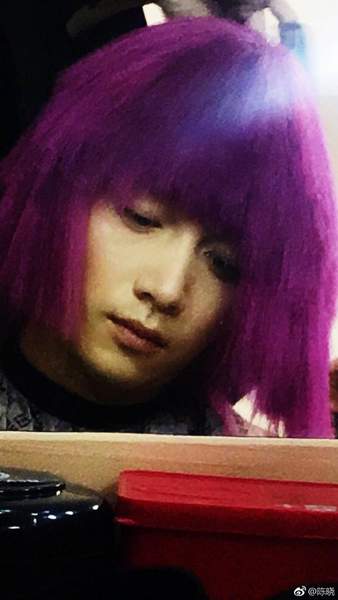 陈晓戴紫色发套扮女装 网友:巴啦啦小魔仙?