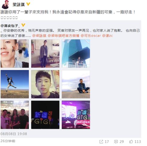8月11日,梁咏琪转发一位粉丝的微博,并配文道:“谢谢你用了一辈子来支持我!我永远会记得你是来自新疆的可乐,一路好走!”这位梁咏琪的粉丝可乐曾被查出癌症晚期,近日不幸离世。