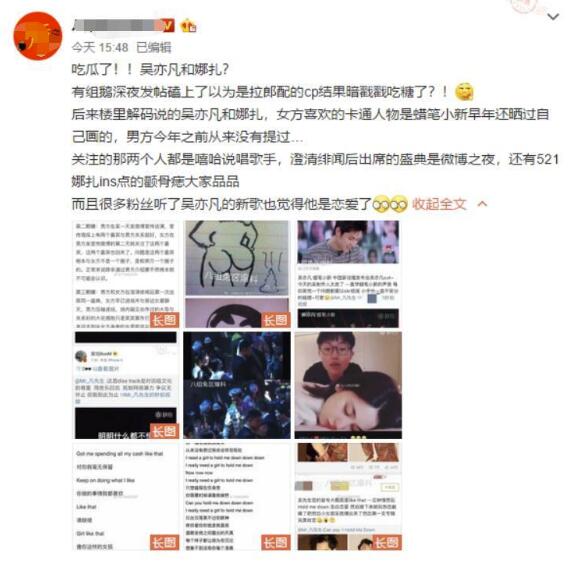 日前,有吴亦凡和娜扎的cp粉扒出两人暗戳戳撒糖,疑似热恋中。吴亦凡工作人员朋友圈发文称:“脑洞不要太大 莫名其妙。”疑似回应此事。
