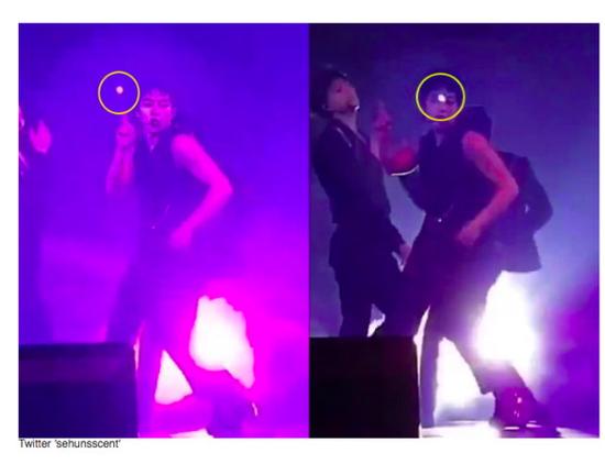 据网络上疯传的影片,EXO不管是在群舞、谈话以及solo时,都会突然出现一只激光笔,直直朝着成员发射,世勋、Xiumin、伯贤都成了受害者,影片里清晰可见,不时有个红点瞄准EXO,头部、眼睛、身体全都成靶心,恶意用激光笔攻击成员,影片曝光后,令歌迷愤怒不已。