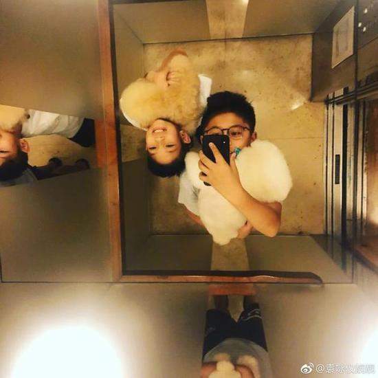 8月14日晚,袁咏仪更新微博晒儿子魔童和其表哥在电梯的自拍照。照片中,魔童表哥怀抱白色小狗,一手拿着相机,仰头对着电梯上方的镜子自拍,魔童则抱着狗狗对镜头灿笑,兄弟俩尽显搞怪可爱的一面。此微博曝光后,
