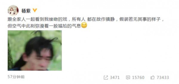 近日,杨紫和邓伦主演的《香蜜》正在热播,两人CP感十足。8月22日晚,杨紫晒照写道:“跟全家人一起看到我接吻的戏,所有人 都在故作镇静,假装若无其事的样子,但空气中此刻弥漫着一股尴尬的气息。”