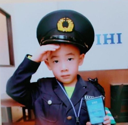 照片中的Jasper穿警服戴警帽,手扶帽檐,眼神帅气,呆萌可爱。