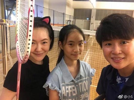 照片中,小S素颜出镜,与女儿、教练合影,笑容满面。