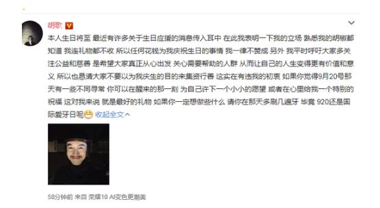 8月24日,胡歌晒照发文称:“本人生日将至,最近有许多关于生日应援的消息传入耳中,在此我表明一下我的立场:熟悉我的胡椒都知道,我连礼物都不收!所以任何花钱为我庆祝生日的事情,我一律不赞成!”“另外,我平时呼吁大家多关注公益和慈善,是希望大家真正从心出发、关心需要帮助的人群,从而让自己的人生变得更有价值和意义。所以也恳请大家不要以为我庆生的目的来集资行善,这实在有违我的初衷。”他还调侃道:“如果你一定想做些什么,请你在那天多刷几遍牙!毕竟,920还是国际爱牙日呢!”