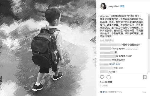 8月27日,应采儿在个人社交账号上晒出儿子Jasper背着书包上学的背影照,Jasper小小个子背着大大书包,更显反差萌。同时,应采儿引用《龙应台写给孩子的信》发文感慨到:“孩子,我要求你读书用功,不是因为我要你跟别人比成绩,而是,我希望你将来会拥有选择的权利,选择有意义、有时间的工作,而不是被迫谋生。当你的工作在你心中有意义,你就有成就感;当你的工作给你时间,不剥夺你的生活,你就有尊严。成就感和尊严,会带给你快乐。 ”