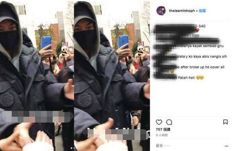 李敏镐现以社会服务要员身份入伍,在社福中心任职,从5月入伍以来,一直都有不少粉丝会接送他上、下班,他也会亲切地握手、收下礼物。16日证实分手消息,他隔日依旧正常上工,穿着厚重黑色羽绒外套、戴着鸭舌帽及口罩,全身包紧紧仅剩眼睛露出,大批粉丝抢着与他握手,随行经纪人只好把人群往外隔开,场面混乱。不过,他下班时,仍旧有亲切与粉丝打招呼问好才离开。