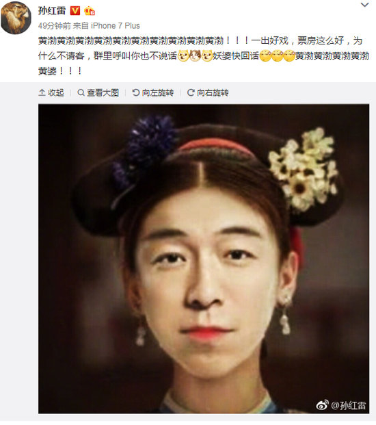 1日,孙红雷发微博“催”黄渤请客,配文:“黄渤黄渤黄渤黄渤黄渤黄渤黄渤黄渤黄渤黄渤!!!一出好戏,票房这么好,为什么不请客?群里呼叫你也不说话。妖婆快回话!黄渤黄渤黄渤黄渤黄婆!!!”此外,孙红雷还配了一张图片,图中黄渤的脸被P进了《延禧攻略》中魏璎珞的扮相中。