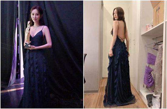 曾莞婷穿着蓝色细肩深V礼服,不仅正面白晰雪乳呼之欲出,一转身后方挖空到腰,整片美背全露出,前后解放辣翻全场,不过红毯上她没被介绍,电视转播画面也被卡掉进广告,她大器回应:“没关系啦!等我入围才有资格说话”、“我只是颁奖人,超时了没关系”,还开玩笑说“我不够红”。