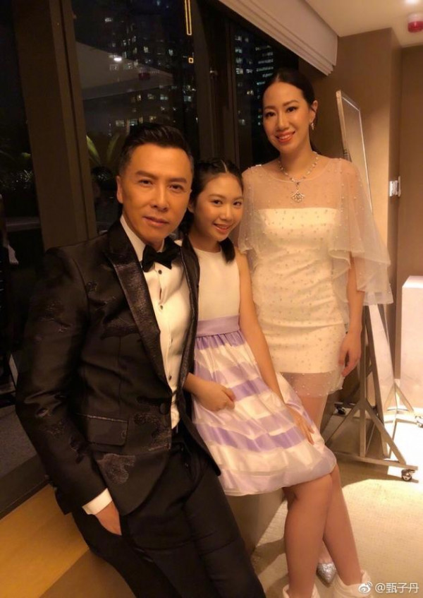 照片中,甄子丹一身黑色礼服,尽显绅士魅力,女儿则一套清爽连衣裙,挽着甄子丹的左手甜甜笑着坐在一边。太太汪诗诗站在镜头的最后面,面容娴静,身材高挑,一家三口,赏心悦目。