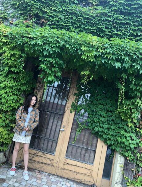 陈乔恩站在绿藤下秀长腿 糖果色穿搭满满少女感
