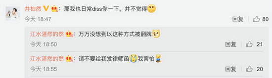 9月5日,有位井柏然的粉丝在微博晒出井柏然参加活动时的照片,并质疑其工作室的拍照技术。不料此微博被井柏然本人看到,并俏皮留言怼粉丝:“那我也日常diss你一下。并不觉得。”