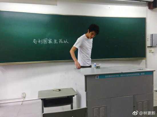 9月6日,林更新上传了一张照片,并配文:“你的学长。”照片中的他身穿白色T恤站在讲台上,帅气十足,身后的黑板上写着“苟利国家以”的字样,字体看起来很工整
