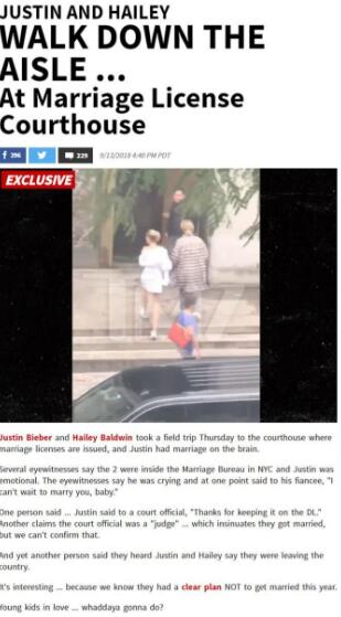 外媒称,Justin Bieber和Hailey Baldwin领结婚证的照片被曝光,比伯和海莉一同去了发放结婚证的法院,还有不少目击者对此消息进行了证实。