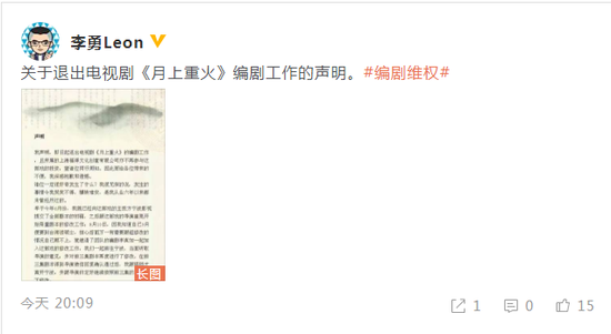 9月17日, 编剧饶俊在朋友圈发长文,自曝在电视剧《月上重火》剧本创作过程中遭剧组期满遇“阴阳剧本”骗局,并声明将退出编剧工作。