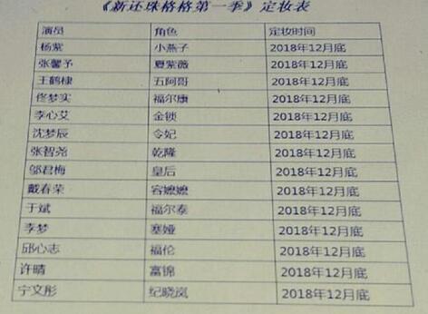 19日,有网友爆料《新版还珠格格第一季》定妆表曝光,并晒出一张定妆表的照片,照片中小燕子一角由杨紫扮演,紫薇由张馨予扮演,王鹤棣出演五阿哥,沈梦辰出演令妃。