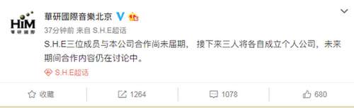 25日,有台媒报道S.H.E另外两位成员任家萱Selina、田馥甄Hebe也将在合约到期后出走华研。对此,华研发文回应,“S.H.E三位成员与本公司合作尚未届期,接下来三人将各自成立个人公