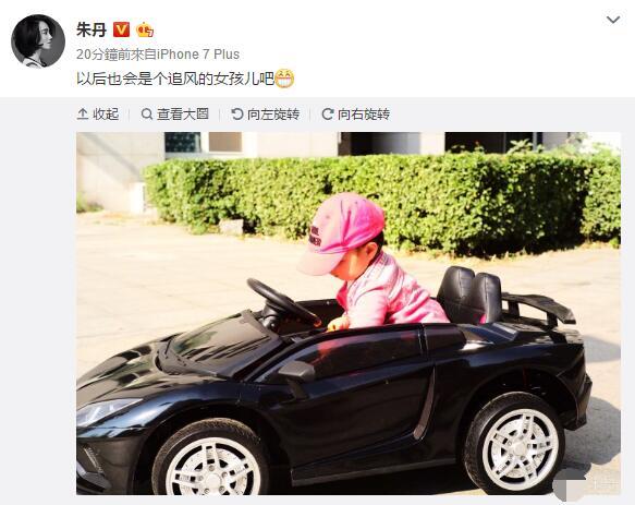 9月26日,朱丹在微博晒出一张女儿的照片,并配文称:“以后也会是个追风的女孩儿吧!”只见女儿坐在黑色玩具车中,一身粉嫩打扮,露出肉肉的侧脸,十分可爱。网友纷纷表示:&ldquo