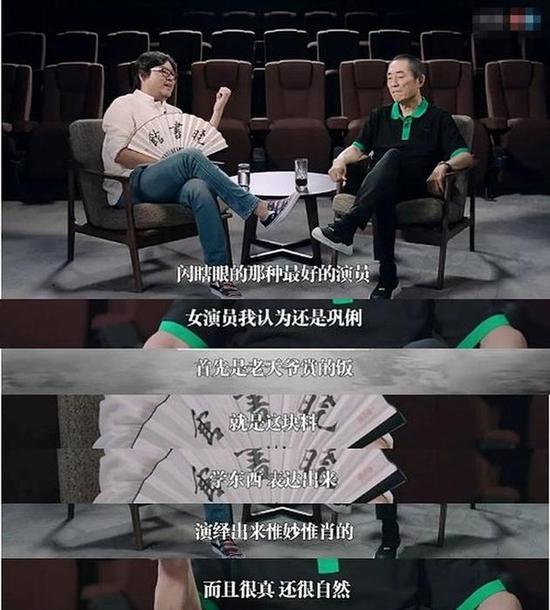 节目中,高晓松问张艺谋觉得才华闪瞎眼的最好的演员是谁,张艺谋认为最好的女演员还是巩俐。当时拍《红高粱》的时候,莫言担心巩俐演不好,因为那时候巩俐瘦瘦高高的,不太符合丰乳肥臀的设定,但原定的史可很符合。拍《秋菊打官司》,编剧刘恒对张艺谋说“导演我只要一想巩俐演这个秋菊我就写不下去了,我就出戏了”,刘恒不相信巩俐能演好,还劝张艺谋不要被情感蒙蔽了双眼,不能啥都让巩俐演,但张艺谋十分坚持,“巩俐就是这块料,演绎出来惟妙惟肖的,而且很真,还很自然”。