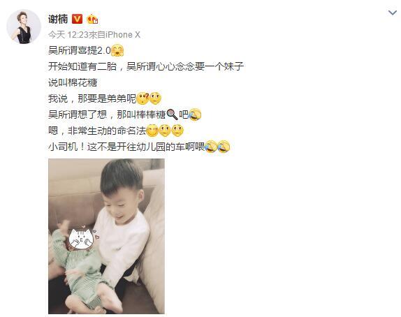 29日,谢楠在微博分享吴所谓的成长趣事,“开始知道有二胎,吴所谓心心念念要一个妹子,说叫棉花糖。我说,那要是弟弟呢?吴所谓想了想,那叫棒棒糖吧!”并调侃儿子,“嗯,非常生动的命名法。小司机!这不是开往幼儿园的车啊喂!”