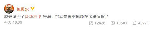 近日,网曝导演毕志飞言辞激烈地表达了自己对包贝尔导演的《胖子行动队》的不看好,随后,包贝尔幽默回应表示感谢看预告。引来网友围观热议。9月30日晚,包贝尔发文向毕志飞道歉,写道:“原来误会了