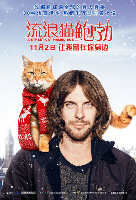 在曝光的定档海报中,男主人公詹姆斯以街头艺人的身份出现,为路人演奏,而萌宠鲍勃则坐在他前面,眼神关切的看着他。虽然人猫没有互动,但詹姆斯与鲍勃的眼神交流暖化人心。在发布的定档预告中,男主人公詹姆斯经历了人生最痛苦的时期,生活的窘迫与家庭的变故让他流浪街头。然而在他想改变现状的时候,“鲍勃”进入了他的生活。詹姆斯经历了多次内心挣扎,最终决定收养它,一起蜕变。一人一猫彼此照顾,暖萌而感动。