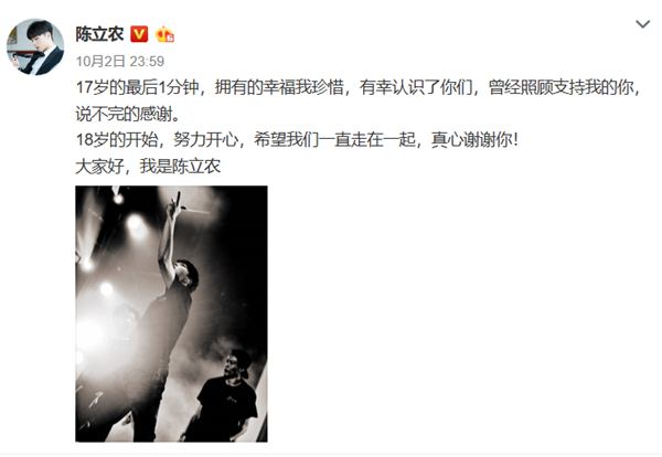 2日23时59分,陈立农发文庆祝自己18岁的生日,并写道:“17岁的最后1分钟,拥有的幸福我珍惜,有幸认识了你们,曾经照顾支持我的你,说不完的感谢。18岁的开始,努力开心,希望我们一直走在