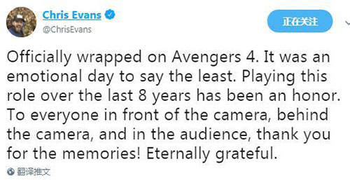 克里斯说到:“我在《复仇者联盟4》的戏份正式杀青了。今天这是伤感的一天。在过去的8年里,扮演这个角色是一种荣誉。致台前幕后、以及每一位观众,谢谢你们带给我的回忆!永远感激。” 言语措辞间充满道别的伤感。