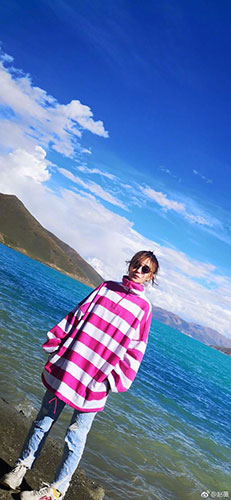 10月5日,赵薇在微博晒出一张照片,配文:“蓝天白云、海阔天空……各位安好。”照片中赵薇戴着墨镜,穿着粉白条纹高领外套搭配破洞牛仔裤,脚上是一双轻便