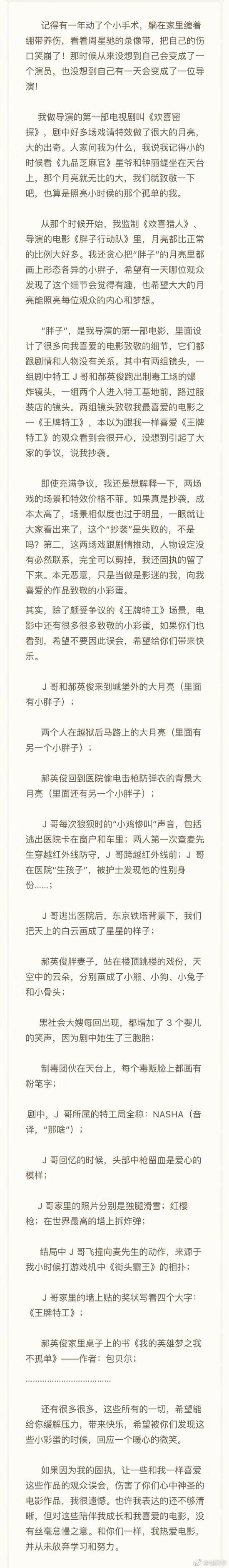 近日,由包贝尔执导,文章、包贝尔领衔主演的喜剧动作电影《胖子行动队》正在热映。其中,因为电影中的部分爆炸镜头和路过服装店的镜头与电影《王牌特工》相似被指抄袭,引发了网友的关注。3日晚,包贝尔就这一问题发文澄清,他表示《胖子行动队》作为自己导演的第一部电影,其中设计了很多向其喜爱的电影致敬的镜头,包括被指抄袭《王牌特工》的部分镜头。包贝尔解释道:“即使充满争议,我还是想解释一下,两场戏的场景和特效价格不菲。如果真是抄袭,成本太高了,场景相似度也过于明显……本无恶意,只是当作影迷的我,向我喜爱的作品致敬的小彩蛋。”包贝尔在文末还对自己引发了误会向观众道歉:“如果因为我的固执,让一些和我一样喜爱这些作品的观众误会,伤害了你们心中神圣的电影作品,我很遗憾。”