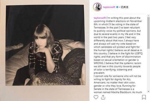10月8日,霉霉在个人社交平台上发长文,反对一名持有歧视LGBT人群、反对女性同工同酬观点的美国参议院候选人Blackburn,以呼吁平权。 在文中,霉霉称自己坚持捍卫LGBT群体的权力,反对性别歧视
