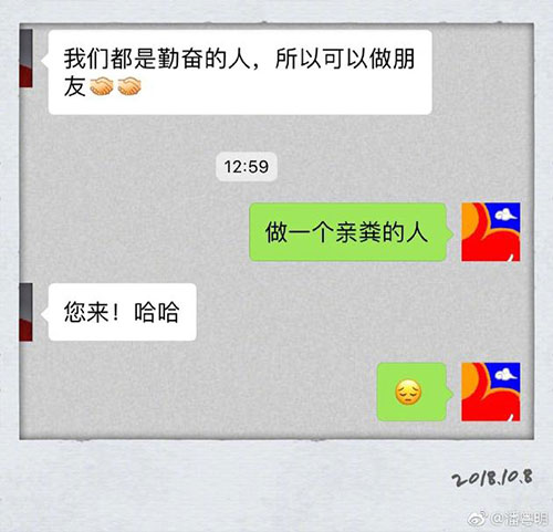 10月8日,潘粤明在自己微博晒出一张截图,并配文称:“哈哈把谐音梗玩儿坏了!”聊天记录中,只见对方说:“我们都是勤奋的人,所以可以做朋友。”潘粤明回复:“做一个亲粪的人。”对方回复:“您来,哈哈!”也是十分搞笑了。