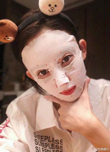 娜扎向粉丝晒晚安福利 脸敷面膜手势娇俏可爱